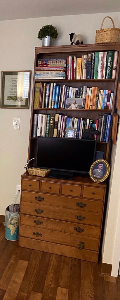 Her bedroom at the memory care facility contains two important pieces of furniture that she will always recognize. One is the dresser from her bedroom set, approximately 75 years old, and one is a dresser/bookcase that is probably almost 70 years old. For most of my life it was in my brother’s room. It was noticed in this last move that the latter piece is now cracked on the side but it will hold together.